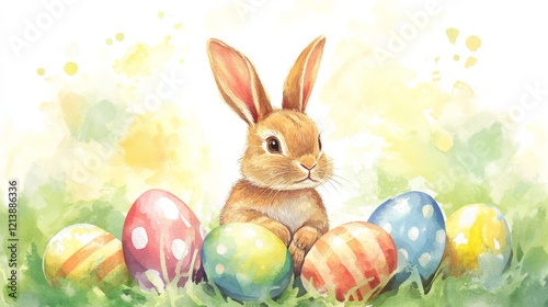 Watercolor bunny surrounded by colorful easter eggs in a spring garden symbolizing joy, celebration, and renewal