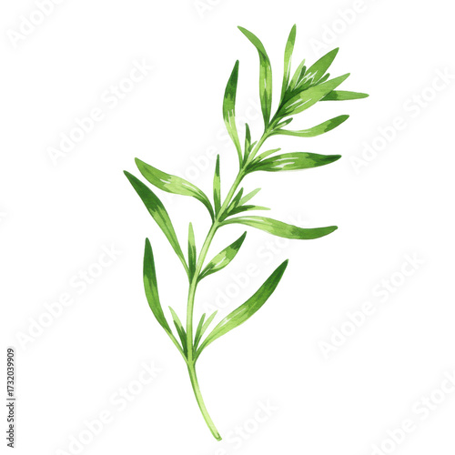 Watercolor illustration of a fresh green tarragon sprig with elongated leaves isolated on white background