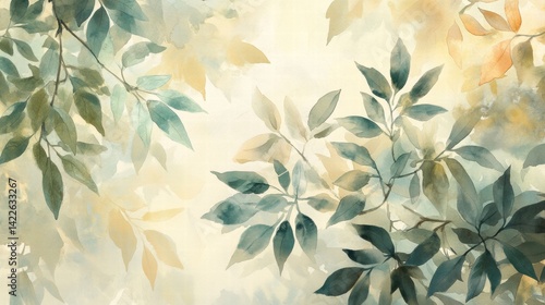 Watercolor Leaves Botanical Art Print Teal Beige Green Foliage