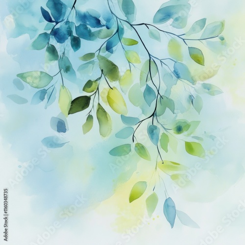 Watercolor painting of a branch with green and blue leaves on a light blue background.
