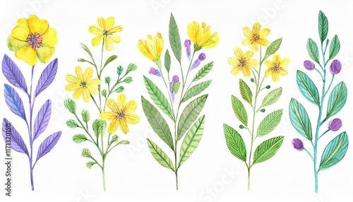 Watercolor painting of floral branches, green leaves. Yellow and purple flowers. Beautiful nature.