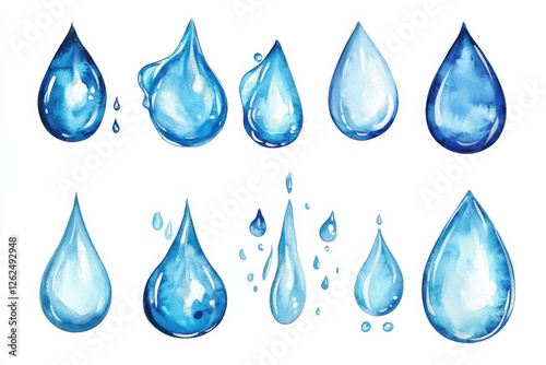 Watercolor Raindrop Collection. Set of Blue Raindrops in Beautiful Watercolor Flow