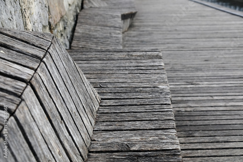 Weathered, abstract wooden bench in Geneva, Switzerland