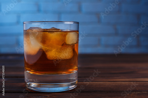 Whiskey with ice cubes on wooden table on brick wall background, copy space. Alcohol drinks, bar concept