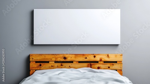 White canvas mockup above a rustic wooden pallet bed with white linens against a gray wall. Clean, minimalist bedroom interior design