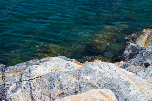 White cliffs and bright blue Mediterranean sea. Rest on the Mediterranean sea in Turkey. Summer, Sunny day