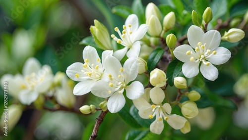 White flowering plant with clusters of delicate blossoms and green leaves in a natural setting.