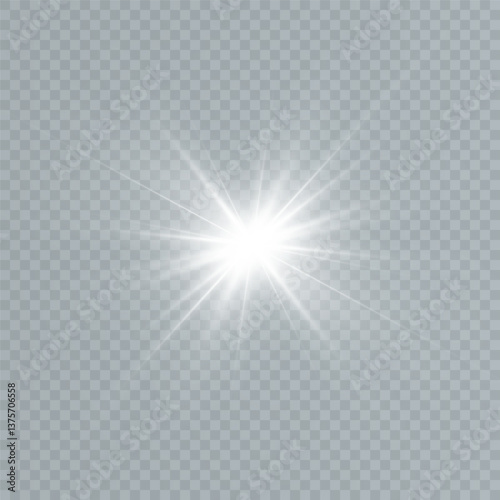 White glowing light explodes with ray. Transparent shining sun, bright flash. Special lens flare light effect.