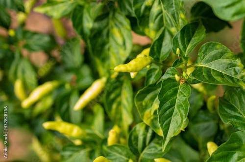 white spicy green chillies on the plant