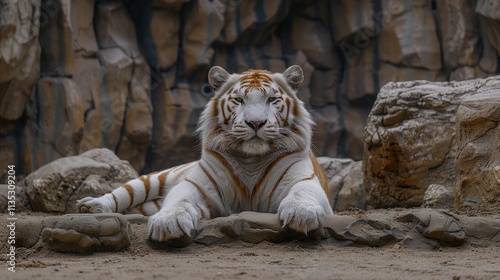 White tiger rests on rocks, looking at camera.