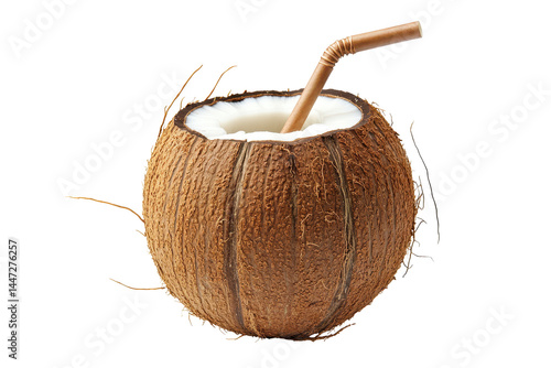 Whole coconut with a straw inserted, filled with a creamy liquid, highlighting a tropical beverage.