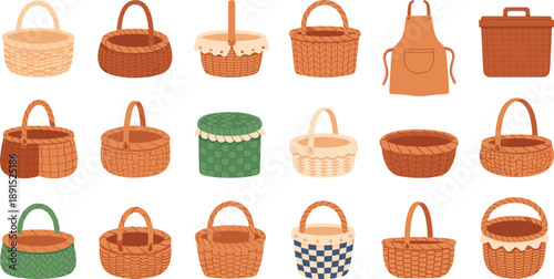 Wicker Basket Vector Illustration Set Featuring Picnic Baskets, Storage Containers, Handmade Weaving, Rustic Kitchen and Home Accessories