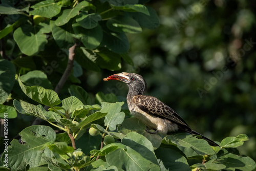 Wild red billed hornbill resting on a leafy branch in bright natural light. The bird's distinctive curved red bill and patterned plumage create an eye catching wildlife scene with rich detail. Ideal