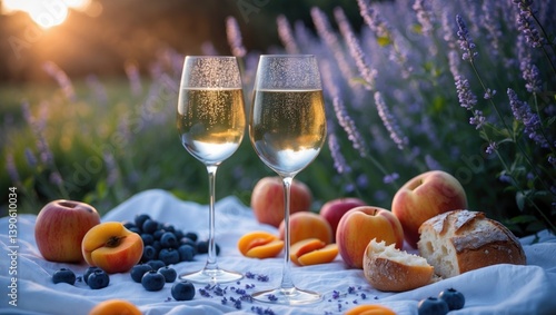 wine, fruits, berries, cheese, glasses picnic in the meadow Selective focus Nature