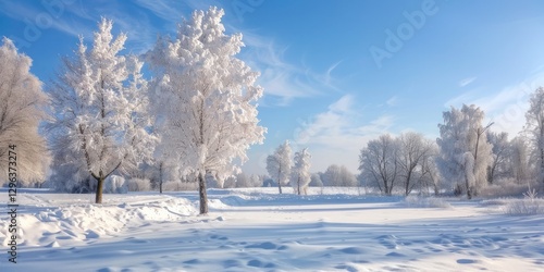 Winter Christmas snowy landscape with snowdrifts and soft fluffy trees against the blue sky day time.