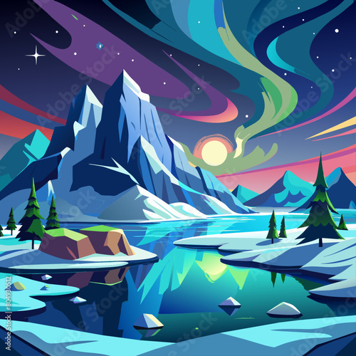 winter landscape with trees and snow, Arctic landscapes with aurora borealis backgrounds.