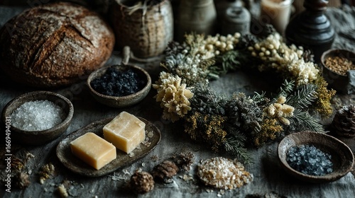 Winter-Themed Flatlay with Wreath, Pine, and Salt Accents