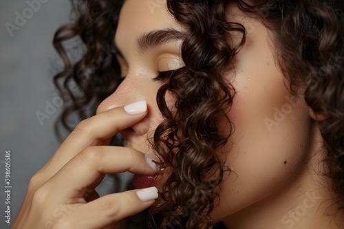Woman applying natural oil on the tips of her curly hair, close up. Oil hair treatment for woman.