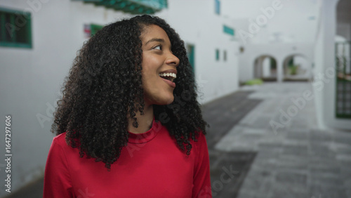 Woman face hair smiles in street with historic archway building under sunshine; carefree joy exploration.