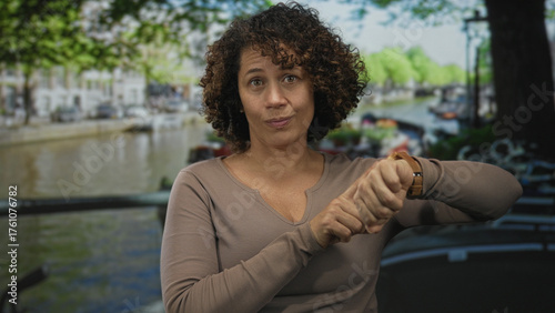 Woman finger pointing to watch on her wrist while standing on a canal street lined with bicycles and water; impatience.