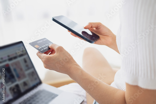 Woman hand holding a smartphone and credit card while shopping online with a laptop at home. Modern consumer lifestyle.