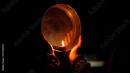Woman hand holding Karwa Chauth strainer for the Karwa Chauth celebration on the night. Karwa Chauth strainer and Diya oil lamps for the Karwa Chauth celebration on the night