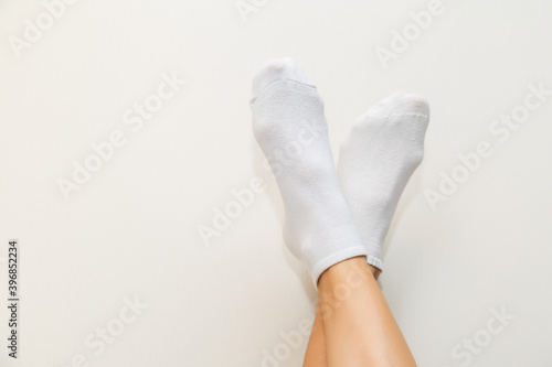 woman in gray socks on a light beige background