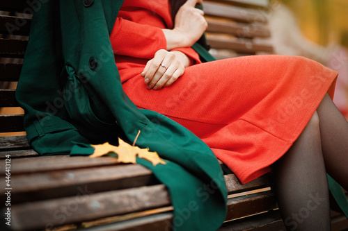 Woman in orange dress and green coat sitting on park bench outdoor. Autumn fashion.