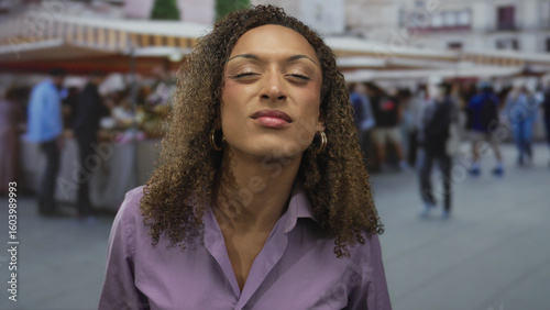 Woman scrunches nose in busy outdoor street market near souvenir stalls and strolling visitors; disgust.