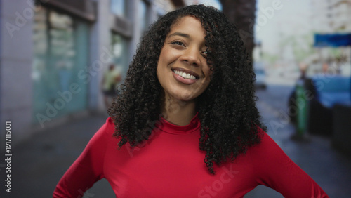 Woman smiling with visible teeth and curly hair on busy city street with hands on hips; confidence.
