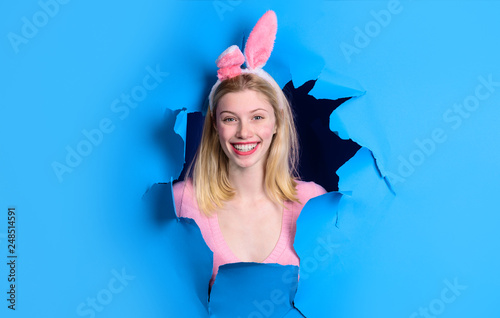 Woman through paper. Happy easter! Bunny ears. Happy woman looking through paper. Egg hunt. Easter. Bunny. Easter hunt. Bunny ears. Breaking paper. Easter Sale. Discount.