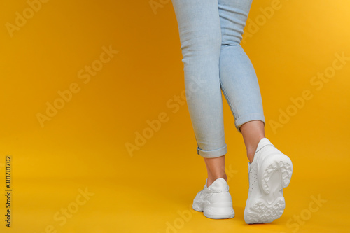 Woman wearing stylish sneakers on yellow background, closeup. Space for text