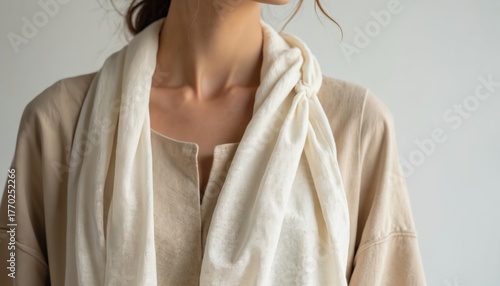 Woman wears linen clothing, scarf. Minimalist outfit in neutral tones. Fashion photo showcases sustainable style. Soft material is visible. Modern trend, comfortable apparel for conscious lifestyle.