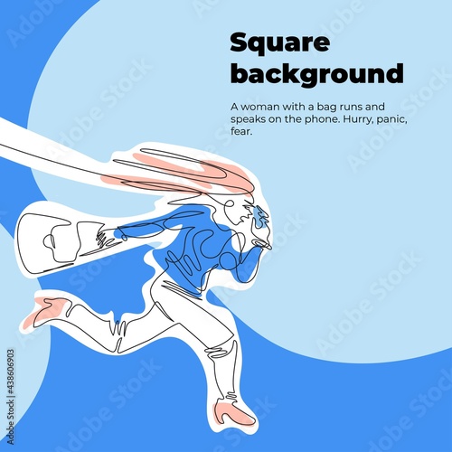 woman with a bag runs and speaks on the phone. Blue banner for social media.