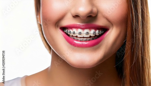 Woman with braces. Smiling girl with braces. Beautiful teeth.