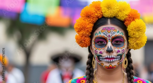 Woman with calavera face paint and marigold flower crown. Celebrating Day of the Dead, a vibrant Mexican cultural tradition for Dia de los Muertos.