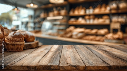Wooden board empty table background. abstract blurred bakery shop background
