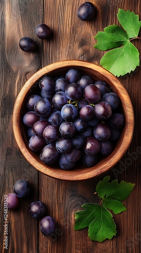 Wooden Bowl of Purple Grapes on Dark Wood