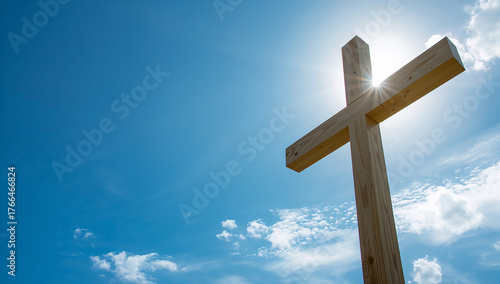 Wooden Cross Illuminated by Bright Blue Sky and Sunlight