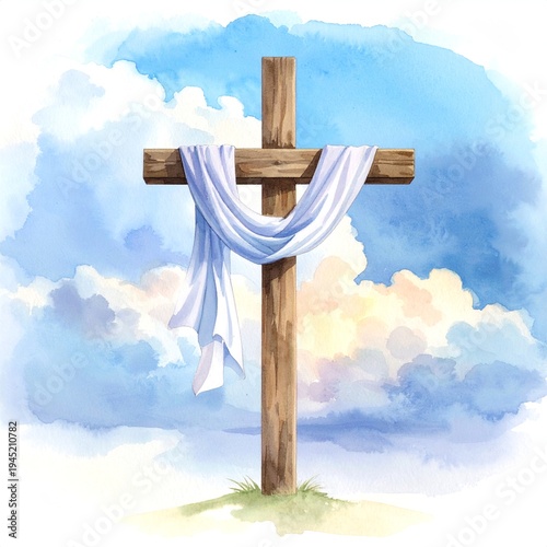 Wooden Cross With Flowing Cloth Against Dramatic Storm Clouds Symbolizing Faith Sacrifice Hope and Resurrection Spiritual Art
