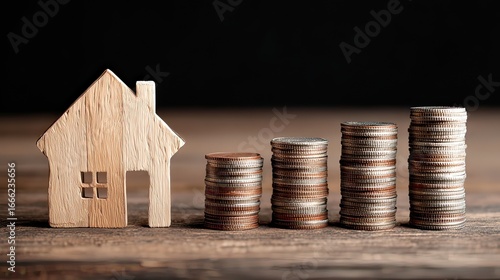 Wooden House Model Surrounded by Stacks of Coins Representing Investment Growth in Real Estate Sector