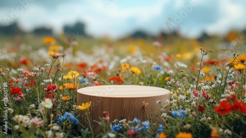 Wooden platform in vibrant wildflower meadow under blue sky with fluffy clouds showcasing a beautiful natural landscape for outdoor photography