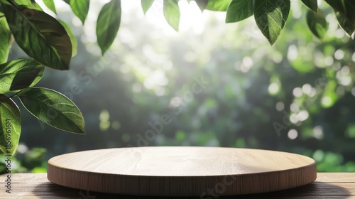Wooden product display podium surrounded by blurred leaves in a natural setting during daylight