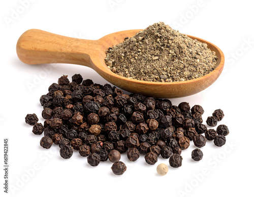 Wooden Scoop of Ground and Whole Black Peppercorns