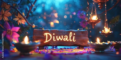 wooden sign. carved written into the sign is the word "Diwali'". - festive scene