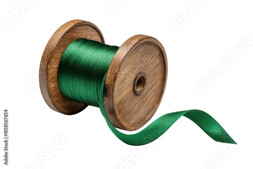 Wooden spool with wound green satin ribbon against black background image, Png, Isolated on Transparent Background, Cut Out
