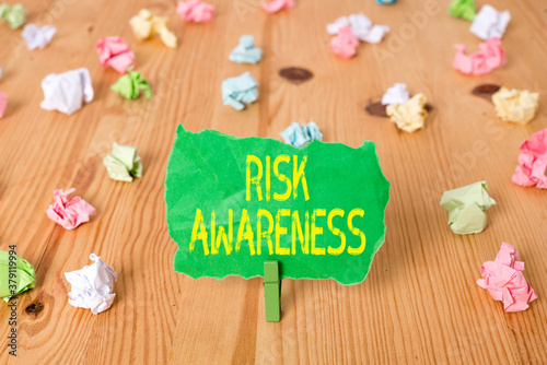 Word writing text Risk Awareness. Business photo showcasing recognizing factors that may cause a lifethreatening effect Colored crumpled papers empty reminder wooden floor background clothespin