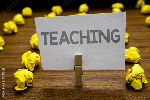 Word writing text Teaching. Business concept for Act of giving information, explaining one subject to a person Clothespin hold holding paper idea reminder crumpled papers several tries.