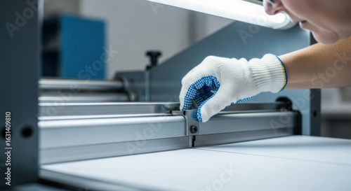 Worker with protective glove adjusting industrial cutting machine for precise sheet processing in modern manufacturing facility, focusing on equipment safety and accuracy