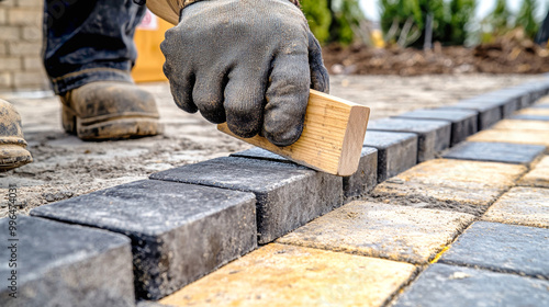 Worker's gloved hands carefully laying pavers on a concrete path in a backyard, using a wooden mallet and a level for precision during construction